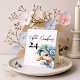 l'histoire d'une étape joyeuse — le tout premier anniversaire, une célébration enveloppée d'amour, de chaleur et d'une touche de fantaisie. Le design est centré autour d'une oie charmante, illustrée avec amour comme si elle avait été arrachée des pages d'un livre pour enfants adoré. Ce n'est pas n'importe quelle oie — C'est « une oie idiote », habillée pour une fête dans un chapeau rayé et une couronne de fleurs, tenant fièrement un ballon bleu. Son expression est écarquillée, innocente et pleine de personnalité — tout comme un enfant d'un an découvrant le monde.