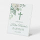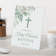 Eucalyptus vert Fleurs blanches Baptême signe piédestal. Éléments correspondants disponibles.