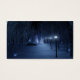 Un sentier enneigé serpentant à travers la forêt de bouleaux, lors d'une nuit d'hiver sombre. Le chemin est bordé de lampadaires qui dégagent une lueur bleu argenté, mais dans les ombres sont lumineuses, des formes fascinantes comme de petites lumières féeriques, attirant le voyageur hors du sentier. Au loin, la lueur de lavande d'un mystérieux rassemblement de forêt illumine le ciel froid.