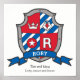 Affiche de monogramme de lettre R de style bouclier de chevaliers parfaite pour la chambre ou la salle de jeux d'un garçon dans des nuances de rouge, bleu, blanc et gris. Personnalisez avec le nom de votre enfant et la signification de son nom pour un touche personnelle dans la chambre ou la nurserie de votre enfant, cet exemple est pour le nom The red king. Hautain, intelligent et courageux. Impression d'affiche idéale comme cadeau pour un nouveau bébé garçon, pour un baptême, une cérémonie de nomination de bébé ou un cadeau de shower de bébé. Dessin de bouclier unique, art graphique, recherche de nom, formulation et conception par Sarah Trett. www.sarahtrett.com pour www.mylittleeden.com