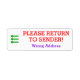 Ce design étiquette comprend les messages "RETOURNEZ À L'ENVOI !" et "Mauvaise adresse", ainsi qu'un symbole décoratif à trois flèches. Il pourrait être utilisé pour indiquer que le courrier reçu peut avoir été mal adressé et doit être retourné à l'expéditeur. [~Z0000168]