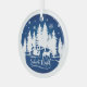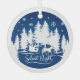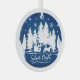 Christmas glass ornament featuring white pines silhouettes with snowflakes and a horse-drawn sleigh over a blue background, with the wording Silent night in handwritten lettering.