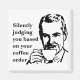 Funny slogan "Silently judging you based on your coffee order" with sophisticated judgmental chap sipping his drink.