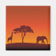 African safari landscape background featuring silhouettes of a giraffe, a tree and an elephant against the sunset in orange and red color shades.
