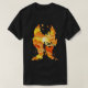 A striking t-shirt design featuring a silhouette of a person standing against a backdrop of fiery, abstract patterns resembling flames. The glowing sun at the centre symbolizes hope, while the vibrant orange and yellow tones evoke energy and creativity, set against a bold black background for dramatic contrast.