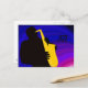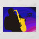 A silhouette of a saxophone player, playing jazz. Blue and purple curves on the background with the word "Jazz" For true saxophone and Jazz lovers.