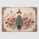 On a delicate parchment background, a stylized Eastern woman stands gracefully in a traditional kimono. The kimono, decorated with vivid red flowers, contrasts beautifully with the subtle hues of the parchment, creating a harmonious blend of tradition and artistry. The image evokes the feel of classic Japanese art, seamlessly integrating elements of nature and fashion. This scene, perfect for a decoupage craft project, could be used on tissue paper or as a centerpiece in a flippin' furniture transformation, adding an elegant and timeless touch.