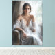 The gentle light from the window illuminates her, highlighting the soft drape of the silk