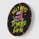 This wall clock challenges gender stereotypes with a playful twist. Featuring a vibrant pink semi-truck against a black background with a bold red rim, it declares "SILLY BOYS TRUCKS ARE FOR GIRLS" in white and yellow lettering with star accents. This fun and empowering design is perfect for any young girl or woman who proudly embraces her love for big rigs.