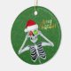 This hanging ceramic ornament has a silly skeleton holding red and green ornaments up to his eyes while smiling and wearing a fur trimmed red Santa Claus hat on a green background with faux gold glittery specks. Merry Christmas text in gold on the front. Customize your text on the back with the template.