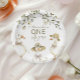 Adorably silly and perfectly sweet, this 1st birthday invitation features three geese in vintage hats and bows beneath a canopy of watercolor florals. With soft beige tones, hand-painted details, and a storybook woodland charm, it’s an ideal pick for a neutral, nature-inspired celebration — whether you’re planning indoors or under the trees.
