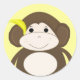 A silly little monkey with a cute face, dark brown fur and a banana in his ear. On a yellow background.