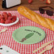 This paper plate is green with a silly man in a brown suit with red tie with a big green pickle for a head that has a face. Customise the Happy Birthday text with the template.