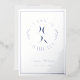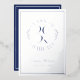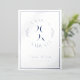 Send elegant silver and blue graduation invitations for your graduate's celebration featuring a chic navy blue typography emblem which reads: CLASS OF [YEAR] GRADUATE with the words curving around the year in the middle with curved botanical leaves along each side of the circular design on a silver foil background. Below the emblem is the graduate's name in a dark blue script font and their school in a sleek serif font. A fine navy rectangle creates a border near the edge.