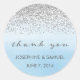 Wedding favours thank you stickers with faux silver glitter design and ombre blue watercolor background.