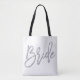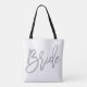 Bride all-over-print tote bags for wedding, bachelorette party or bridal shower with silver glitter effect (faux, printed as an image) text printed on white background. Tote bag is made of polyester and measures 16 inches by 16 inches and the strap measures 28 inches.
