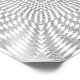 A graphic design of a silver(grey) and white chequered pattern that has been symmetrically distorted to create this unique geometric design.