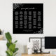 This beautiful wedding seating chart features pale grey text on a black background with seating assignments for 200-240 guests. It features a simple yet stylish and elegant design with ornate decorative faux foil silver filigree in the corners. The title is written in fancy script calligraphy and reads: Please find your table.