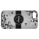 Fun, yet professional, this Personalized Silver Brushed Steel photo and Black floral swirls printed on a plastic iPhone 5 Case-Mate Case is a great way to accessorize your cell phone. Make a fashion statement with your monogram initial and name on a circular tag with a black line on a floral swirls pattern and a solid silver background all printed on this hard shell girly iPhone 5 case.