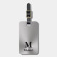 This luggage tag has a faux silver background. On the front, you can personalize your bag tag with your monogram/initial and name. The back has text you can edit to show a custom message (Shown: If found, call or text:), your full name, and phone number. The brushed metal look is an artistic rendering. This is not a foil product.