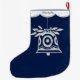 A pretty stylistic silver Christmas tree is the feature on the front of this Christmas stocking. The modern style, impressionistic tree is topped with a silver star, with the script words in silver that say "Joy", "Hope", and "Peace" beside it. Your name or other custom text is in blue on the scalloped white top edge which is rimmed with a grey border. The back of the stocking has the same border, name, and a silver bell image. Everything is put on a dark blue background.
