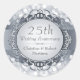 Celebrate the 25th anniversary couple with a sticker that celebrates this achievement in style. Faux silver bokeh images sprinkle down against a silver gradient background. The main text is highlighted in an ornament held on by a silver ribbon image. Great as envelope seals or favours. Available in alternate colours with matching products.