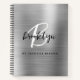 This personalized recipe notebook features a monogram and first name in modern black and white script on a silver faux brushed metal background, with the additional text in black sans serif font below.