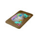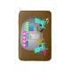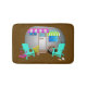 Camping theme bath mat with silver trailer and tropical theme. Brightly coloured awnings decorate this cute camping trailer with two aqua blue chairs just outside the door. Pink flamingos and a seashell decorate the campsite and the background colour is sand brown. Smallest size is shown with two larger sizes available.