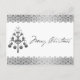 A modern Christmas post card featuring a silver Christmas tree surrounded by a silver snowflake border, with the message 'Merry Christmas' written on the card.