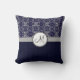 Silver Damask on Blue with Stripes and Monogram Throw Pillow