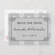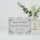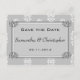 A very elegant, custom wedding save the date postcard in grey and silver, part of the ''Silver Damask'' matching set of wedding stationery featuring a grey and white damask pattern with silver ornament.