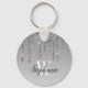 This chic keychain features a silver background with sparkling silver faux glitter drips. Customize it with your initial in white serif font and your name in dark grey handwriting-style brush script.
