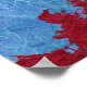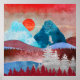 A beautiful abstract landscape design with mountain and forest scene and an eagle landing on a tree in vibrant shades of blue, cyan, silver, and crimson.