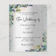 Faux silver looking background decorated with eucalyptus greenery, golden foliage and silver and green faux glitter, sparkles. Personalize and add your names and wedding details. Black letters.