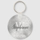 This chic keychain features a pattern of faux glitter diamond confetti on a silver faux foil background. Personalize it with your initial in white serif font and your name in charcoal grey handwriting-style brush script.