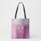 This chic tote bag features pink brushed metal background with sparkling silver Faux-Glitter border. Add your name and initial for a personal touch.