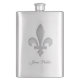 This Premium Flask features a large silver fleur-de-lis centred on the front. Personalize with your name in a flowing silver script. The Fleur-de-lys is an emblem or coat of arms of francophone origin. The motif here is silver on a metallic silver background but the background colour can be changed.