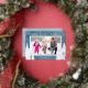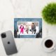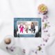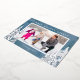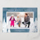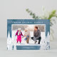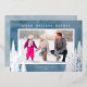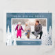 A simple photo Christmas card featuring a blue watercolor background accented with real silver foil pine and evergreen trees. The design offers a horizontal photo frame with the greeting "Warm Holiday Wishes".
