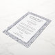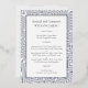 Rectangular wedding menu template with a silver foil border. Grey text is printed over a white panel bordered by a geometric pattern which is the foil part of this card. Reverse is solid grey. Only the border will be foil and you may change it to gold or rose gold.