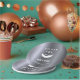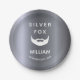 Silver fox theme for a birthday party for men, guys. A white icon a male beard and moustache. A dark faux silver foil metallic looking background. Personalize and add a name and a date. With the text: Silver Fox.