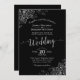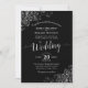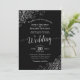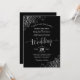 This beautiful wedding invitation features a simple yet elegant design with lacy script calligraphy on a black background and frilly silver gray faux foil filigree in the corners. The wording is formal, but the layout is modern and stylish.