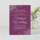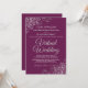 Just because you've been forced to move your wedding to a virtual ceremony, doesn't mean you can't send out beautiful invitations. This elegant invite features fancy grey script lettering on a magenta plum or berry purple coloured background with lacy silver faux foil floral filigree or curls and swirls in the corners. Perfect way to invite your friends and family to share in your special day, even if they can't be there in person.