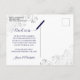 This beautiful save the date postcard will give your friends and family advance notice of your upcoming wedding. It features a clever design with a custom calendar where you can put a heart around your wedding date. The background is navy blue, with light gray text and decorative silver gray faux foil frilly accents in the corners. The back has a cute graphic reading "pencil us in" with space for your own custom note.