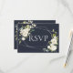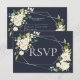 Modern and trendy, this wedding invitation RSVP design features a faux silver geometric embellished with watercolor white floral and eucalyptus greenery floral arrangements, over a modern navy blue texture. Meal choices are included, which are easily personalized. Part of a matching wedding set. Copyright Elegant Invites. All rights reserved.