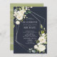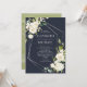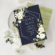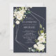 Modern and trendy, this wedding invitation design features a faux silver foil geometric embellished with watercolor eucalyptus greenery and white floral arrangements, on a modern navy blue background. The back of the card features a green hand painted watercolor texture. Copyright Elegant Invites, all rights reserved.