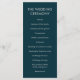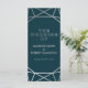A winter wedding program, features a "faux foil" silver geometric pattern over a dark turquoise background. All your details are spelled in a beautiful modern typo.