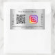 A faux silver metallic looking background. Personalize and add your business name, your own qr code to your Instagram account and a text. Black text. With the text x2: Follow us!