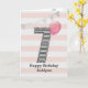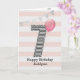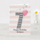 Pink and silver glitter 7th birthday card for girls, which you can personalize with her name. The front of this 7th birthday card for her features the number seven in a black and white stripe with an outline of glitter with a pink balloon ready to float way. Please note the glitter is a design effect and no actual glitter will be on this birthday card. The background is a soft white and pink with a gold bunting banner at the top.The inside message can be easily personalized if you wanted. A unique 7th birthday card for granddaughter, daughter, niece, etc.