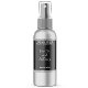 This elegant product label for cosmetic bottles features a black background with a faux silver glitter foil border. This label contains space for your product name, business name, product weight, ingredients, instructions, social media, and business address.