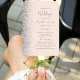 This elegant, modern wedding program fan features a blush pink background edged with silver faux glitter. The text appears in elegant grey handwriting and copperplate fonts.